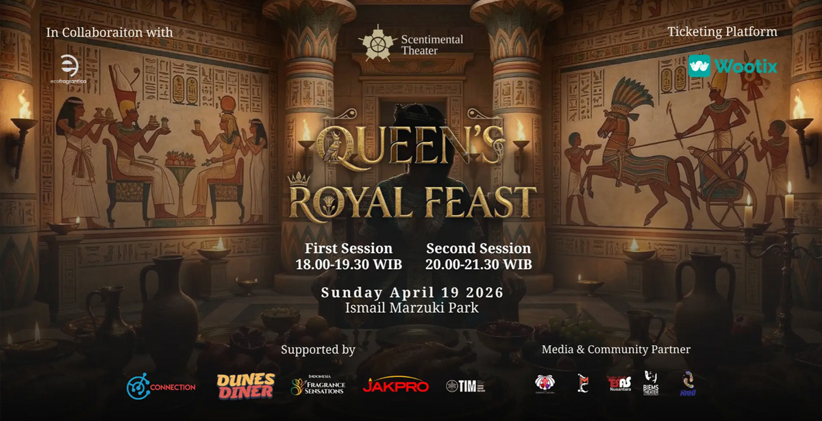 Taman ISMAil Marzuki, 19 April 2026Fragrantions bersama @byscentimental mempersembahkan sebuah pertunjukan teater bertajuk, "Scented Theater Immersive Dinner “Queen’s Royal Feast". Pengunjung akan...