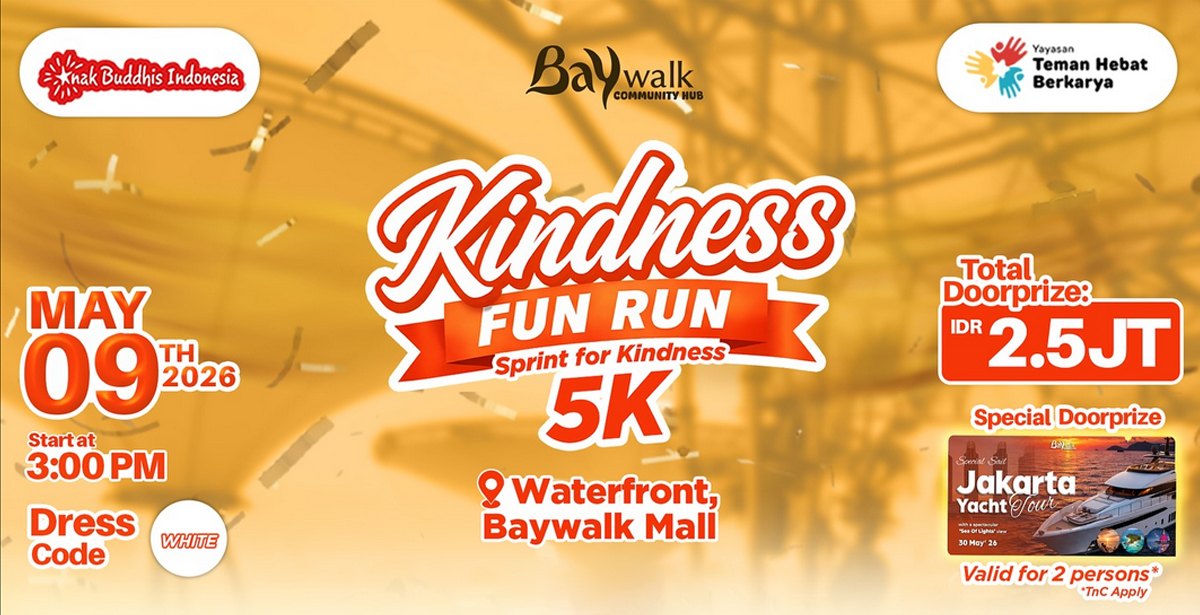 Waterfront Baywalk Mall, 9 Mei 2026Baywalk Kindness Fun Run 2026 hadir sebagai ajang olahraga seru yang terbuka bagi semua kalangan. Nikmati pengalaman berlari di area waterfront ikonik Baywalk Mall d...