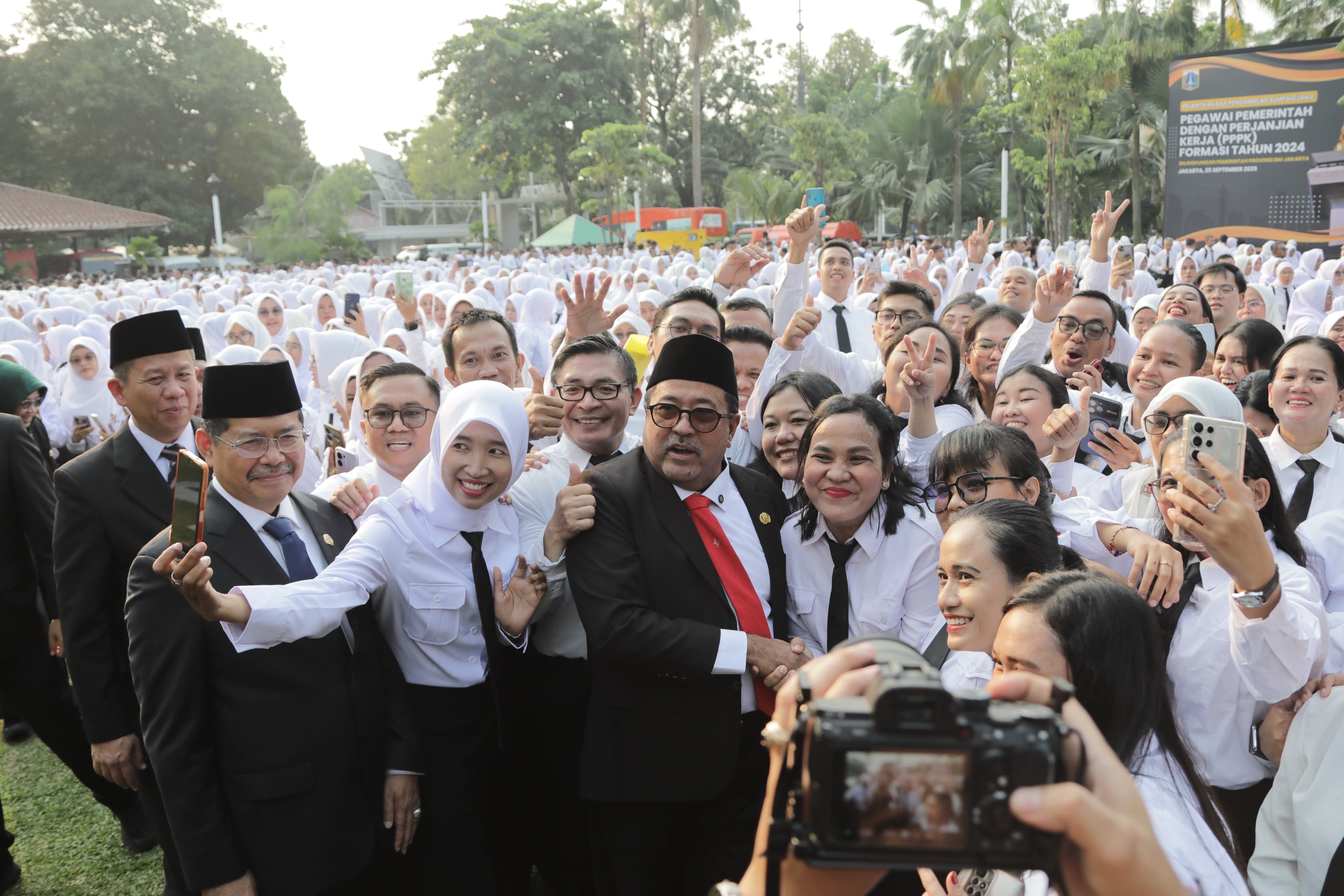 Wakil Gubernur (Wagub) DKI Jakarta, Rano Karno, melantik 1.939 Pegawai Pemerintah dengan Perjanjian Kerja (PPPK) Tahap II di lingkungan Pemerintah Provinsi (Pemprov) DKI Jakarta di Halaman Balai Kota Jakarta, pada Kamis (25/9). Pelantikan PPPK di lingkungan Pemprov DKI Jakarta dibagi menjadi dua tahap. Sebelumnya, Gubernur DKI Jakarta, Pramono Anung, telah melantik 2.703 PPPK pada akhir Agustus lalu.