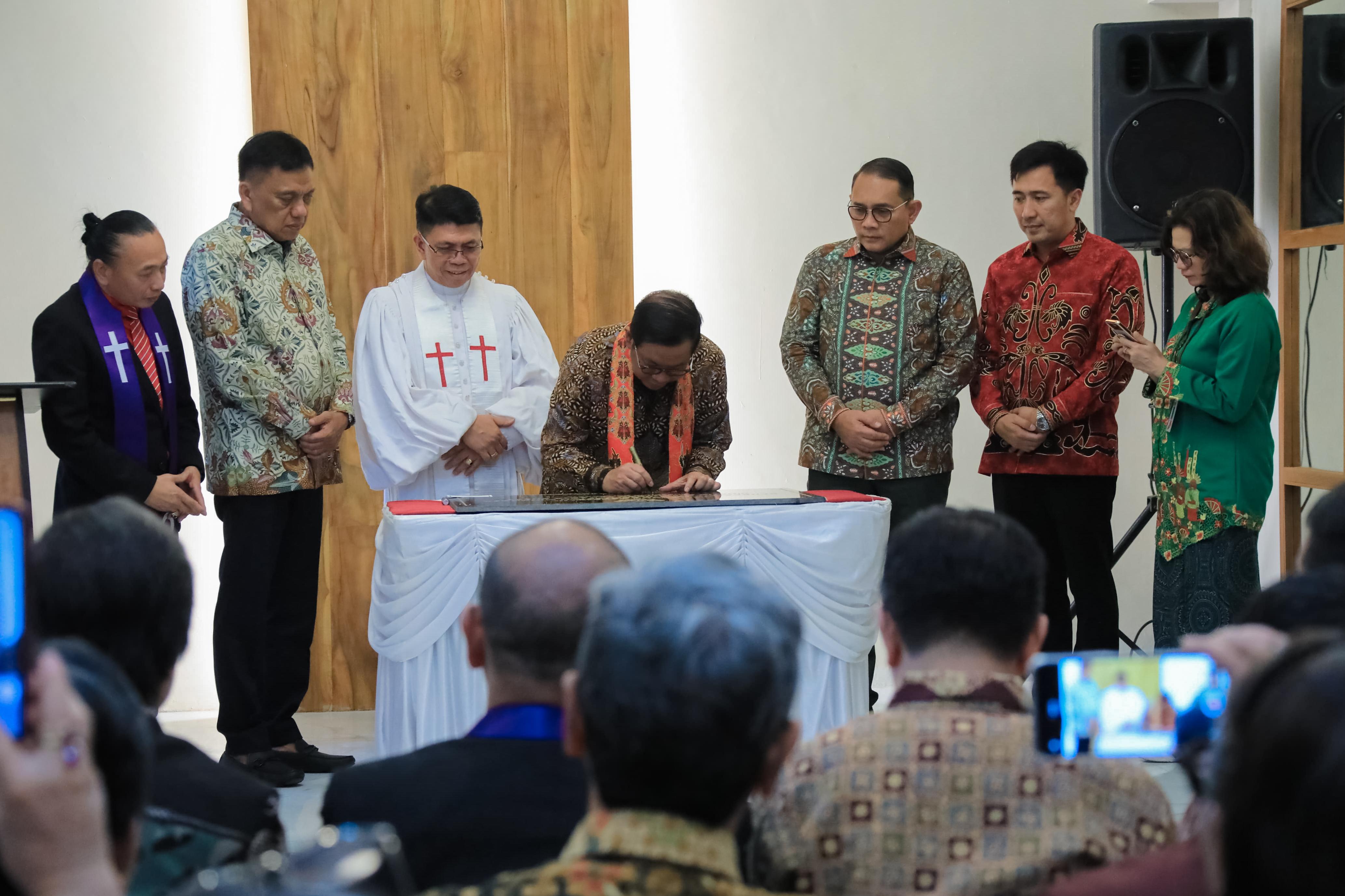 Gubernur DKI Jakarta, Pramono Anung, meresmikan Gedung Kerapatan Gereja Protestan Minahasa (KGPM) Sidang Sejahtera, di Senen, Jakarta Pusat, pada Sabtu (14/2). Dalam sambutannya, Gubernur Pramono mengapresiasi komitmen pengurus KGPM yang telah menyelesaikan renovasi gedung gereja untuk kenyamanan bersama.